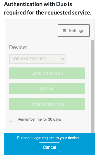Duo Push is designed to make two-factor authentication simple and seamless for everyone from anywhere. If auto-push is disabled or if you click the Cancel button on the Duo Prompt you can select a different device from the drop-down at the top if youve enrolled more than one or select any available factor to verify your identity to Duo. Other Multi-Factor Authentication Methods Theres a solution for every situation.